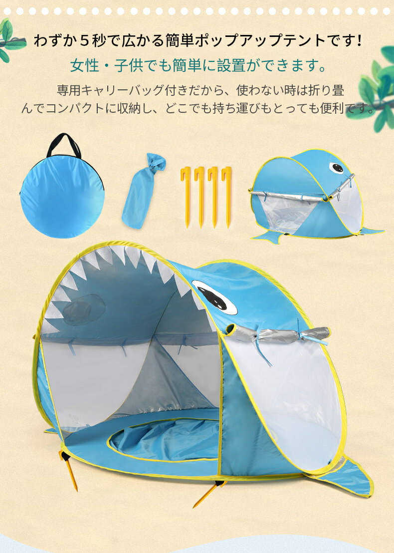 この商品は ポップアップテント プール 子供用テント 蚊帳 ベビービーチテント キッズポップアップテント アウトドアプレイテント ポータブルシェードプール UPF 50+ UV保護 サンシェルター ポイント ポップアップテント かわいい UVカット SPF50+ 日焼け止め 超軽量 花見・海水浴・砂浜・運動会・アウトドアに最適 4ペグ付き 収納バッグ付き 多目的ベビービーチテント ビーチ、公園、裏庭、あらゆる柔らかい地面に最適です。